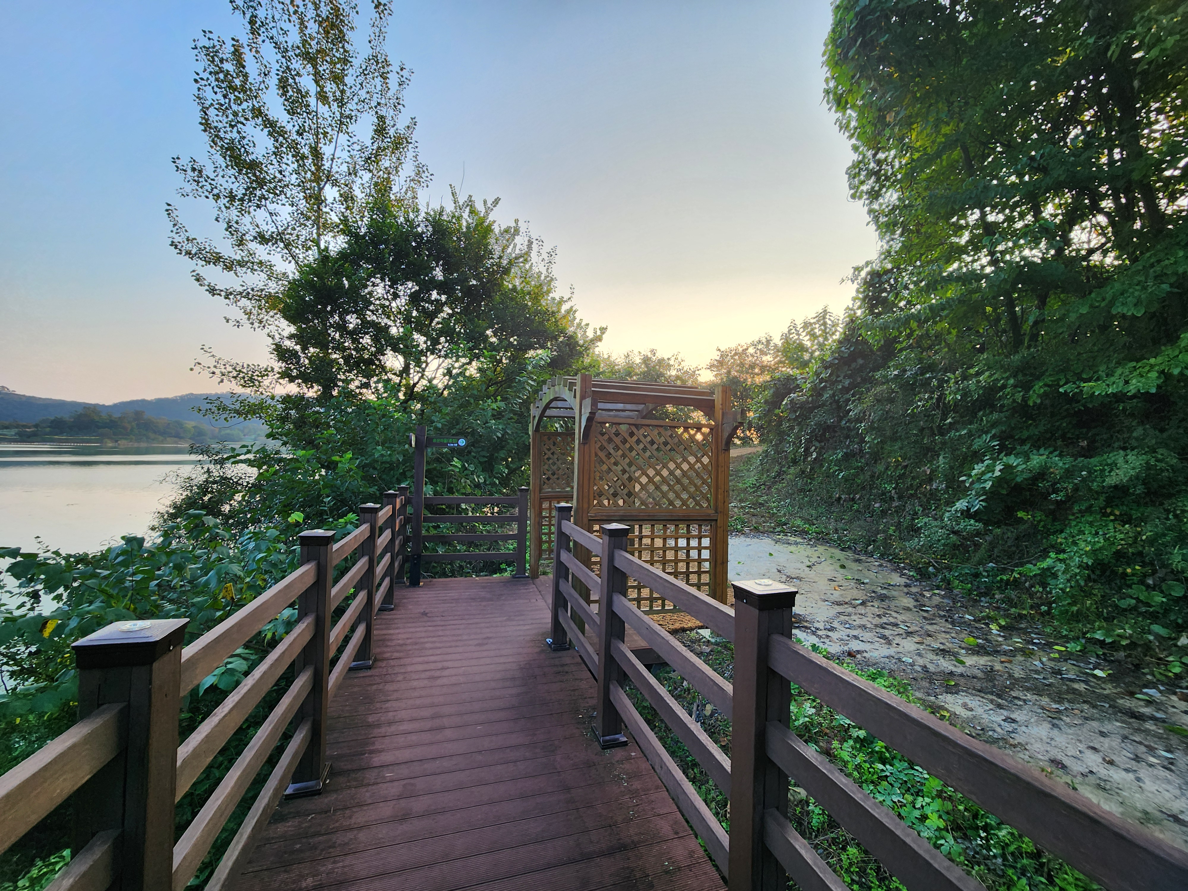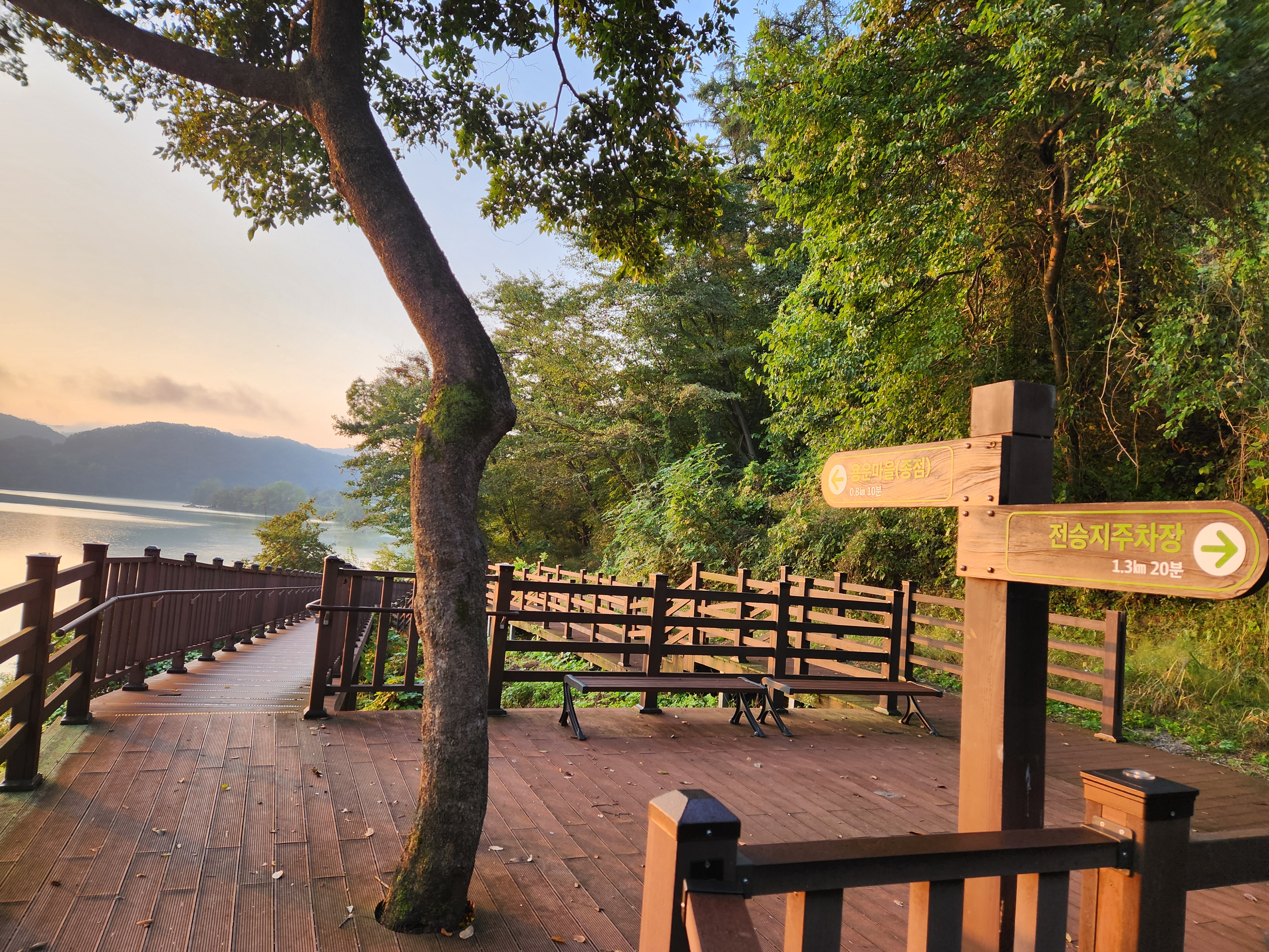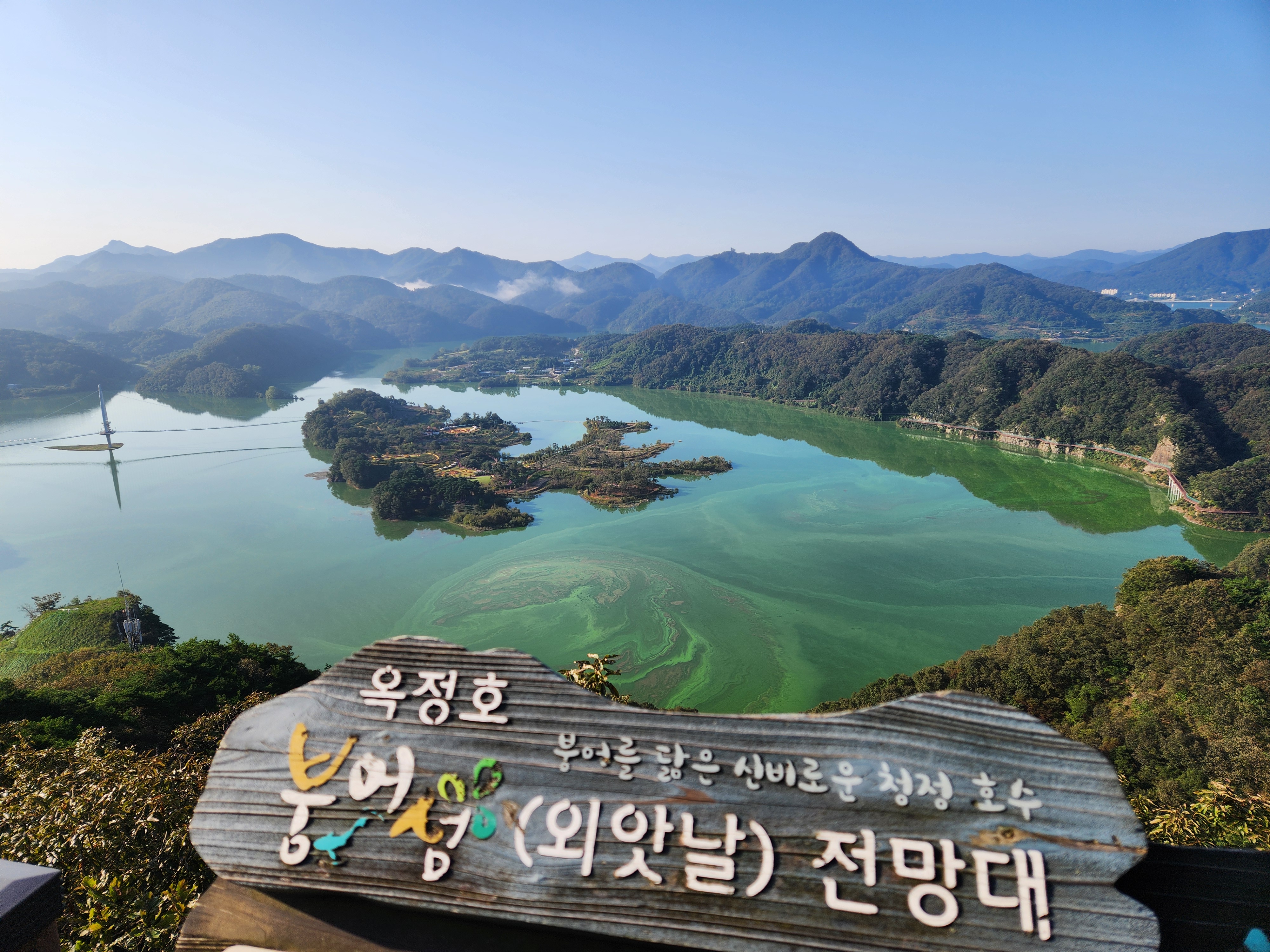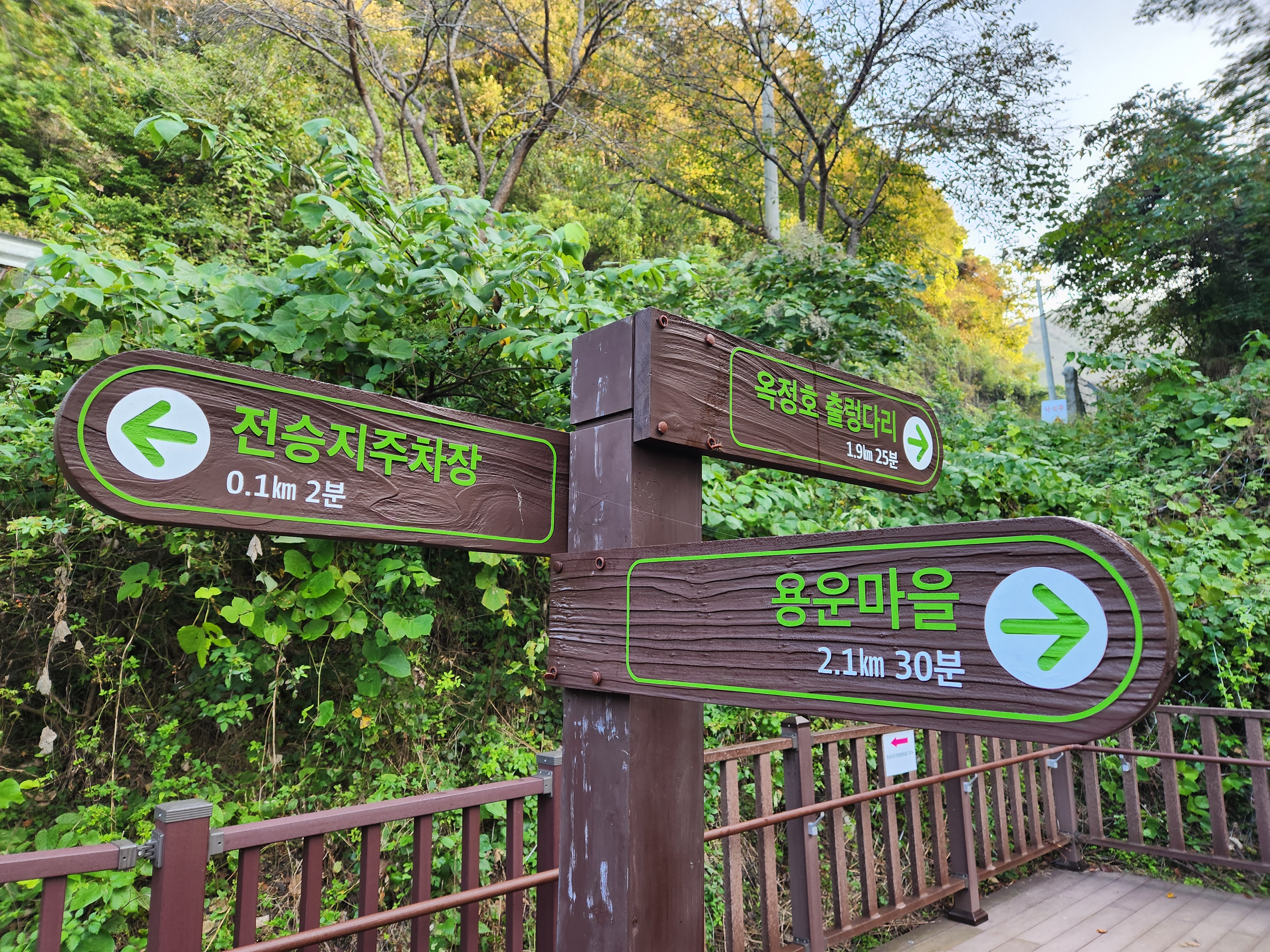 운암 전승지주차장 중간에 임진왜란 당시에 임실군 운암면 전투에서 천명의 의병을 이끌고 만여명의 왜군을 섬멸한 충장공 양대박 장군의 승전을 기념하기 위한 승전비가 세워져 있다.기존 옥정호 물안개길에다 4㎞ 붕어섬길을 새롭게 조성해 옥정호 붕어섬의 절경을 더욱 가까이 볼 수 있도록 했다. 전승지주차장에서 출발해 용운마을을 되돌아 와 붕어섬길과 출렁다리를 지나 붕어섬 생태공원 그리고 국사봉전망대까지 이어지는 약 12㎞ 탐방 코스를 걸어 본다.양대박 장군 승전비 옆으로 길을 따라 수변으로 갔더니 전망태크로 들어가는 곳을 막아 놓았다. 나 같은 사람이 한 둘이 아니었는가 보다 난간을 넘어간 흔적을 볼 수 있다.전승지주차장에서 용운마을까지 2.1km의 잔도길을 설치되어 있다.일교차가 큰 이른 가을 아침, 물안개가 피어오르며 섬의 자태가 드러나는 붕어섬의 모습은 절경이다. 이제는 현수교 출렁다리의 풍경까지 보게 되었다.걷는 내내 옥정호잔도길을 통해 붕어섬을 비롯한 옥정호의 주변절경을 감상할 수 있다.출렁다리에 이어 잔도길도 전국에 유행처럼 만들어 지고 있다. 삶의 질을 높이려는 목적이 있겠지만 과연 좋은 현상인지 생각해 볼 문제다.일출은 한참 지났지만 산에 가려 이제사 일출같은 모습을 볼 수 있다.간간히 쉼터도 있었 쉬어갈수 있으나 햇빛 가림막이 없는 것이 아쉽다.잔도길이 끝나고 용운마을까지 300여m 야자매트를 걷게 되어 있다.운암면 용운리용운마을 반환점에서 왔던 길을 되돌아 붕어섬출렁다리로 간다.되돌아 가는 길에는 오봉산과 국사봉이 전면에 들어와 좀 더 깊이 옥정호를 들여다보는 코스로 호수와 산이 빚어낸 작품들 속을 걸으며 신선이 된 듯한 기분을 느낄 수 있다.걷다보면 물속에 또 하나의 산세를 감상할 수 있다.그러고 보니 4코스 옥정호 물안개 길은 무장애 데크길이다. 전승지주차장에서 부터 갈지자로 무장애 데크길을 만들어 놓았다.다시 전승지주차장에서 출렁다리로 간다.잔도길을 걷다보면 길을 통해 감수성을 풍부히 끌어올리고 영감을 얻을 수 있으며,바라보는 것 만으로도 산과 호수가 빚어낸 붓터치와 상쾌한 바람을 맞으며 시상을 통해 누구라도 화가가 될 수 있고 시인이 될 수 있을 것이다.전승지주차장에서 약 1.9m 정도에 잔도길이 끝나며, 국사봉으로 올라가는 갈림길이 나온다.갈림길에서 300여 미터에 붕어섬출렁다리 매표소가 있다. 출렁다리는 09시부터 입장을 하여 국사봉 전망대부터 가기로 한다.등산길을 따라 가다보면 전망처에서 내려다 보는 붕어섬 출렁다리가 한폭의 그림같이 다가 온다. 붕어섬 주변에서 가장 높은 나래산 정상에 구름 띠가 둘러져 있다.잔도 갈림길에서 약 600여m 올라가니 도로건너 국사정 정자가 보이고 그 뒤로 보이는 봉우리가 국사봉이다.국사봉 주차장에서부터 바로 가파른 계단이 이어진다. 경사가 만만치 않아 거리에 비해 힘이 좀 드는 편이다. 다행히 가장 꼭대기 전망대까지 300m 정도에 불과해 시간은 많이 걸리지 않는다. 아주 천천히 걸어도 10분 안팎이면 닿을 수 있다.국사봉으로 올라가는 등산로에 3개의 전망대가 연속으로 나오는데, 마지막 3번째 전망대가 붕어섬을 조망하는대 제일 좋은 곳이다.전망대에 서면 발아래로 옥정호 물길이 수직으로 내려다보인다. 크게 휘돌아가는 물길 속 외앗날도 손에 잡힐 듯 가깝다. 옥정호 붕어섬으로 불리는 '외앗날'은 하늘을 닮아 푸른 호수에 거대한 금붕어 한 마리가 누워 있는 형상이다.오봉산과 국사봉 산이 호수를 양팔을 벌려 감싸 안은 듯한 풍경과 사계절 다르게 보여진 옥정호 붕어섬은 사진작가가 많이 찾는 최고의 명소다.아침햇살을 받아 호수 면으로부터 아지랑이처럼 피어오르는 물안개는 마치 신선이나 노닐 법한 풍경으로 국사봉에서 보는 옥정호 붕어섬은 최고의 백미로 마치 백두산 천지에 와있는 듯한 착각을 일으키게 하는 곳인데, 아쉽게도 안개가 없다.옥정호출렁다리 매표소에서 성인기준 4,000원으로 매표를 한 후 출렁다리를 건너간다.출렁다리 입구부터 가을의 감성을 물씬 담은 국화로 조성을 하여 놓았다.붕어섬에서 하루는 아니어도 반나절이라도 알차게 보낼수 있다.옥정호 출렁다리 개통과 더불어 눈으로만 보던 붕어섬은 생태공원으로 탈바꿈하였다.길이 420m, 폭 1.5m의 옥정호출렁다리는 붕어 이미지를 표현한 80m의 주탑과 스틸 그레이팅 바닥 판으로 강바닥이 보여서 건너는 내내 흥미를 더한다.물고기를 형상화한 외관도 독특하지만 주탑 전망대에 오르면 옥정호 일대가 파노라마로 펼쳐진다.출렁다리 입구는 요산공원이다. 공원은 꽃으로 알록달록 장식돼 있다. 그 너머로 망향탑이 우뚝하고 그 옆에 양요정이란 정자가 아늑하게 자리잡고 있다. 조선 선조 때 인물인 최응숙이 임진왜란 이후 낙향해 지은 정자다. 양요정은 맹자의 ‘인자요산(仁者樂山) 지자요수(智者樂水)’에서 왔다. 아래 강가에 있었던 것을 수몰되기 전 옮겼다고 한다.붕어섬은 강물이 휘돌아 가는 물돌이동 지형이다. 외앗날이라는 향토 지명이 있는데, 사진작가들이 애칭으로 붕어섬이라고 하여서 관광지 이름이 되었다.붕어섬의 구