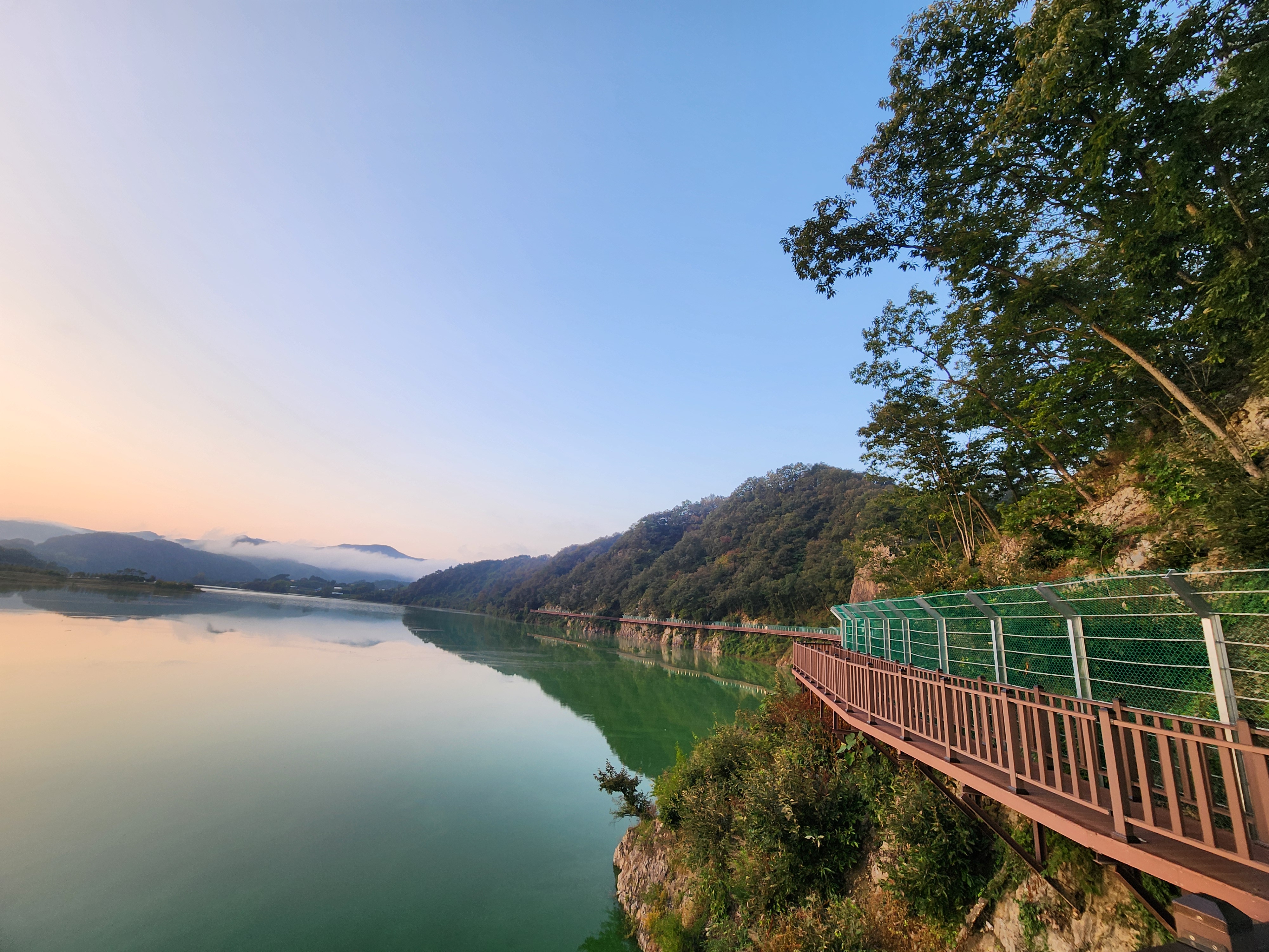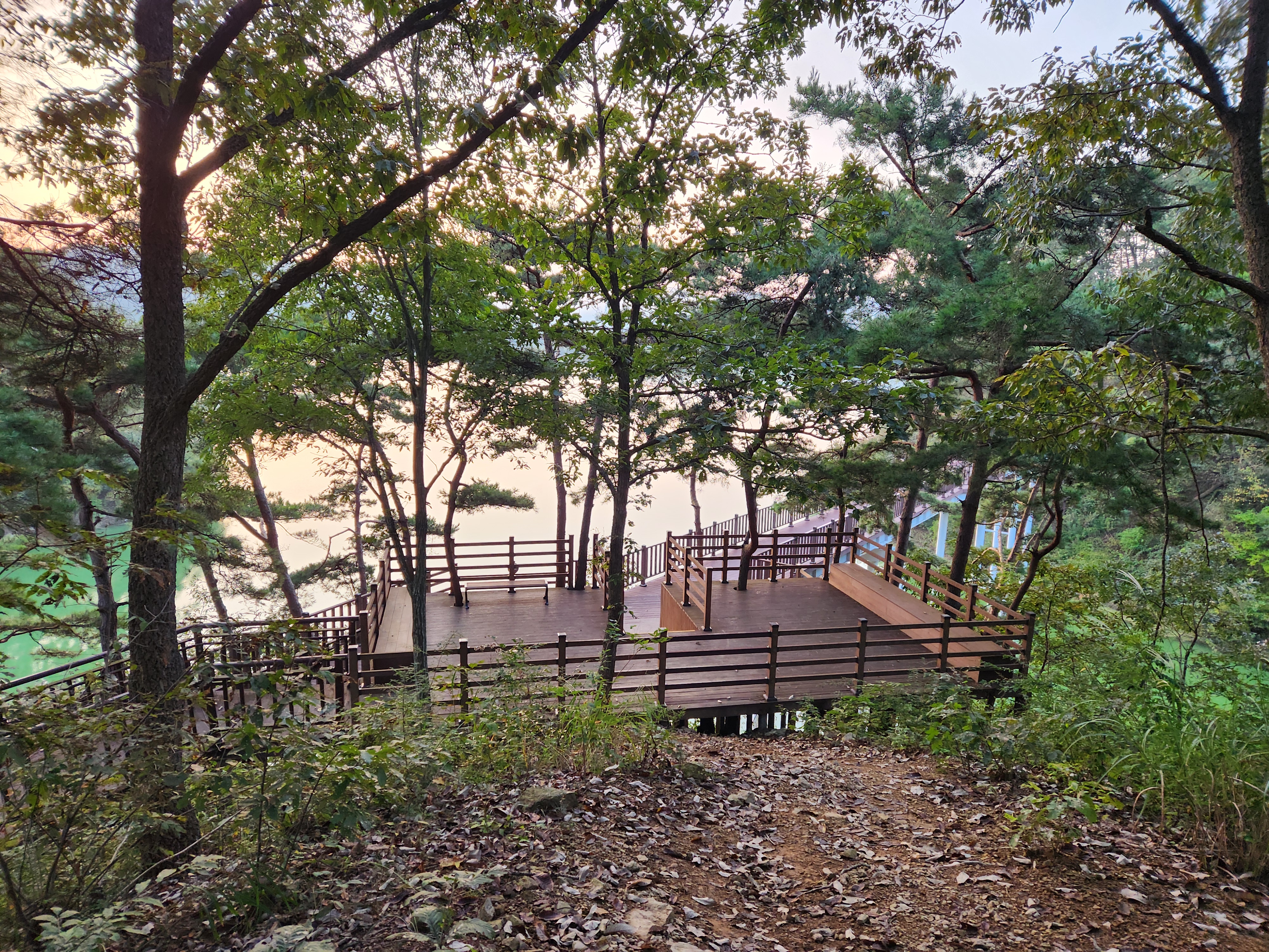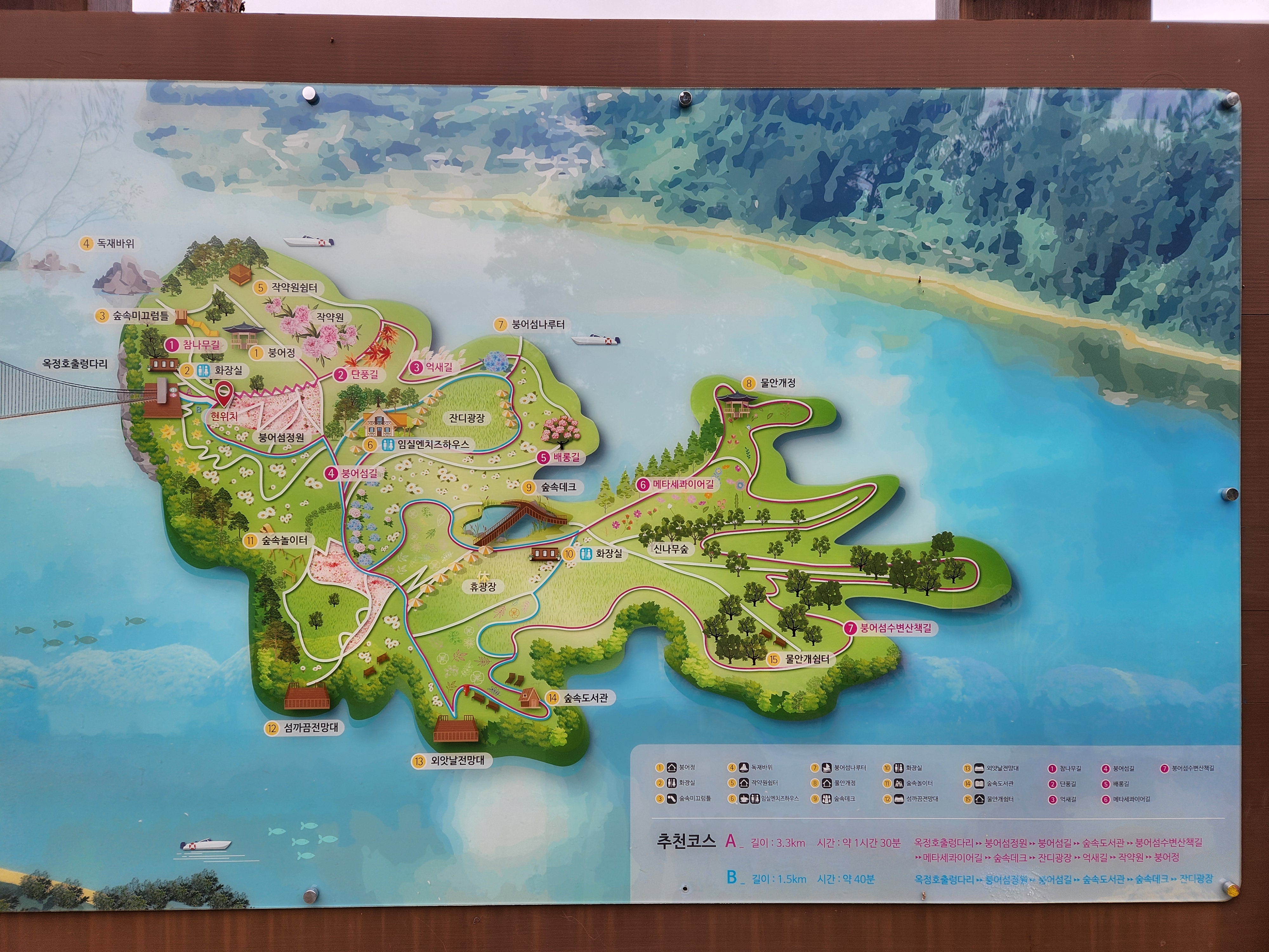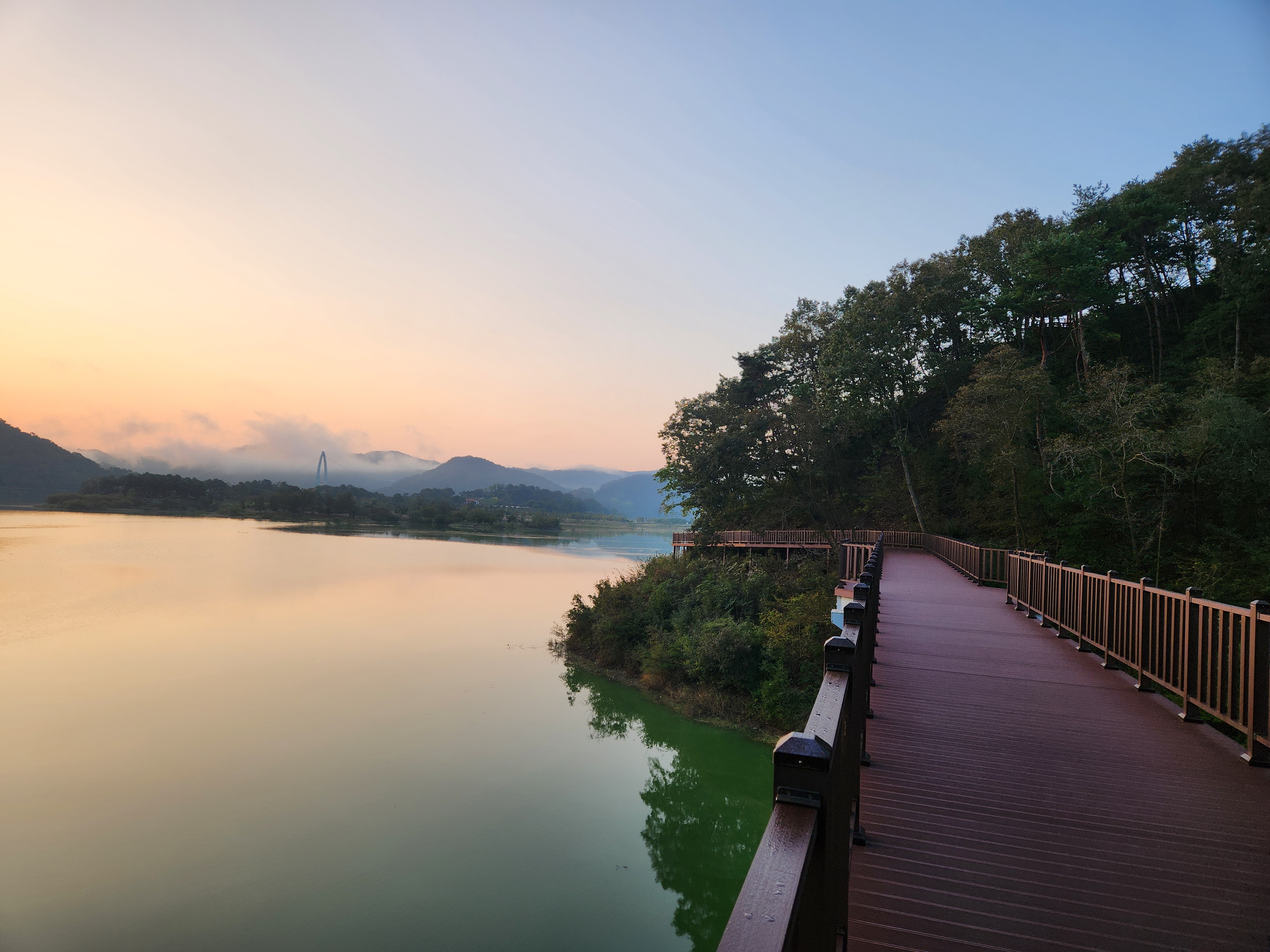 운암 전승지주차장 중간에 임진왜란 당시에 임실군 운암면 전투에서 천명의 의병을 이끌고 만여명의 왜군을 섬멸한 충장공 양대박 장군의 승전을 기념하기 위한 승전비가 세워져 있다.기존 옥정호 물안개길에다 4㎞ 붕어섬길을 새롭게 조성해 옥정호 붕어섬의 절경을 더욱 가까이 볼 수 있도록 했다. 전승지주차장에서 출발해 용운마을을 되돌아 와 붕어섬길과 출렁다리를 지나 붕어섬 생태공원 그리고 국사봉전망대까지 이어지는 약 12㎞ 탐방 코스를 걸어 본다.양대박 장군 승전비 옆으로 길을 따라 수변으로 갔더니 전망태크로 들어가는 곳을 막아 놓았다. 나 같은 사람이 한 둘이 아니었는가 보다 난간을 넘어간 흔적을 볼 수 있다.전승지주차장에서 용운마을까지 2.1km의 잔도길을 설치되어 있다.일교차가 큰 이른 가을 아침, 물안개가 피어오르며 섬의 자태가 드러나는 붕어섬의 모습은 절경이다. 이제는 현수교 출렁다리의 풍경까지 보게 되었다.걷는 내내 옥정호잔도길을 통해 붕어섬을 비롯한 옥정호의 주변절경을 감상할 수 있다.출렁다리에 이어 잔도길도 전국에 유행처럼 만들어 지고 있다. 삶의 질을 높이려는 목적이 있겠지만 과연 좋은 현상인지 생각해 볼 문제다.일출은 한참 지났지만 산에 가려 이제사 일출같은 모습을 볼 수 있다.간간히 쉼터도 있었 쉬어갈수 있으나 햇빛 가림막이 없는 것이 아쉽다.잔도길이 끝나고 용운마을까지 300여m 야자매트를 걷게 되어 있다.운암면 용운리용운마을 반환점에서 왔던 길을 되돌아 붕어섬출렁다리로 간다.되돌아 가는 길에는 오봉산과 국사봉이 전면에 들어와 좀 더 깊이 옥정호를 들여다보는 코스로 호수와 산이 빚어낸 작품들 속을 걸으며 신선이 된 듯한 기분을 느낄 수 있다.걷다보면 물속에 또 하나의 산세를 감상할 수 있다.그러고 보니 4코스 옥정호 물안개 길은 무장애 데크길이다. 전승지주차장에서 부터 갈지자로 무장애 데크길을 만들어 놓았다.다시 전승지주차장에서 출렁다리로 간다.잔도길을 걷다보면 길을 통해 감수성을 풍부히 끌어올리고 영감을 얻을 수 있으며,바라보는 것 만으로도 산과 호수가 빚어낸 붓터치와 상쾌한 바람을 맞으며 시상을 통해 누구라도 화가가 될 수 있고 시인이 될 수 있을 것이다.전승지주차장에서 약 1.9m 정도에 잔도길이 끝나며, 국사봉으로 올라가는 갈림길이 나온다.갈림길에서 300여 미터에 붕어섬출렁다리 매표소가 있다. 출렁다리는 09시부터 입장을 하여 국사봉 전망대부터 가기로 한다.등산길을 따라 가다보면 전망처에서 내려다 보는 붕어섬 출렁다리가 한폭의 그림같이 다가 온다. 붕어섬 주변에서 가장 높은 나래산 정상에 구름 띠가 둘러져 있다.잔도 갈림길에서 약 600여m 올라가니 도로건너 국사정 정자가 보이고 그 뒤로 보이는 봉우리가 국사봉이다.국사봉 주차장에서부터 바로 가파른 계단이 이어진다. 경사가 만만치 않아 거리에 비해 힘이 좀 드는 편이다. 다행히 가장 꼭대기 전망대까지 300m 정도에 불과해 시간은 많이 걸리지 않는다. 아주 천천히 걸어도 10분 안팎이면 닿을 수 있다.국사봉으로 올라가는 등산로에 3개의 전망대가 연속으로 나오는데, 마지막 3번째 전망대가 붕어섬을 조망하는대 제일 좋은 곳이다.전망대에 서면 발아래로 옥정호 물길이 수직으로 내려다보인다. 크게 휘돌아가는 물길 속 외앗날도 손에 잡힐 듯 가깝다. 옥정호 붕어섬으로 불리는 '외앗날'은 하늘을 닮아 푸른 호수에 거대한 금붕어 한 마리가 누워 있는 형상이다.오봉산과 국사봉 산이 호수를 양팔을 벌려 감싸 안은 듯한 풍경과 사계절 다르게 보여진 옥정호 붕어섬은 사진작가가 많이 찾는 최고의 명소다.아침햇살을 받아 호수 면으로부터 아지랑이처럼 피어오르는 물안개는 마치 신선이나 노닐 법한 풍경으로 국사봉에서 보는 옥정호 붕어섬은 최고의 백미로 마치 백두산 천지에 와있는 듯한 착각을 일으키게 하는 곳인데, 아쉽게도 안개가 없다.옥정호출렁다리 매표소에서 성인기준 4,000원으로 매표를 한 후 출렁다리를 건너간다.출렁다리 입구부터 가을의 감성을 물씬 담은 국화로 조성을 하여 놓았다.붕어섬에서 하루는 아니어도 반나절이라도 알차게 보낼수 있다.옥정호 출렁다리 개통과 더불어 눈으로만 보던 붕어섬은 생태공원으로 탈바꿈하였다.길이 420m, 폭 1.5m의 옥정호출렁다리는 붕어 이미지를 표현한 80m의 주탑과 스틸 그레이팅 바닥 판으로 강바닥이 보여서 건너는 내내 흥미를 더한다.물고기를 형상화한 외관도 독특하지만 주탑 전망대에 오르면 옥정호 일대가 파노라마로 펼쳐진다.출렁다리 입구는 요산공원이다. 공원은 꽃으로 알록달록 장식돼 있다. 그 너머로 망향탑이 우뚝하고 그 옆에 양요정이란 정자가 아늑하게 자리잡고 있다. 조선 선조 때 인물인 최응숙이 임진왜란 이후 낙향해 지은 정자다. 양요정은 맹자의 ‘인자요산(仁者樂山) 지자요수(智者樂水)’에서 왔다. 아래 강가에 있었던 것을 수몰되기 전 옮겼다고 한다.붕어섬은 강물이 휘돌아 가는 물돌이동 지형이다. 외앗날이라는 향토 지명이 있는데, 사진작가들이 애칭으로 붕어섬이라고 하여서 관광지 이름이 되었다.붕어섬의 구
