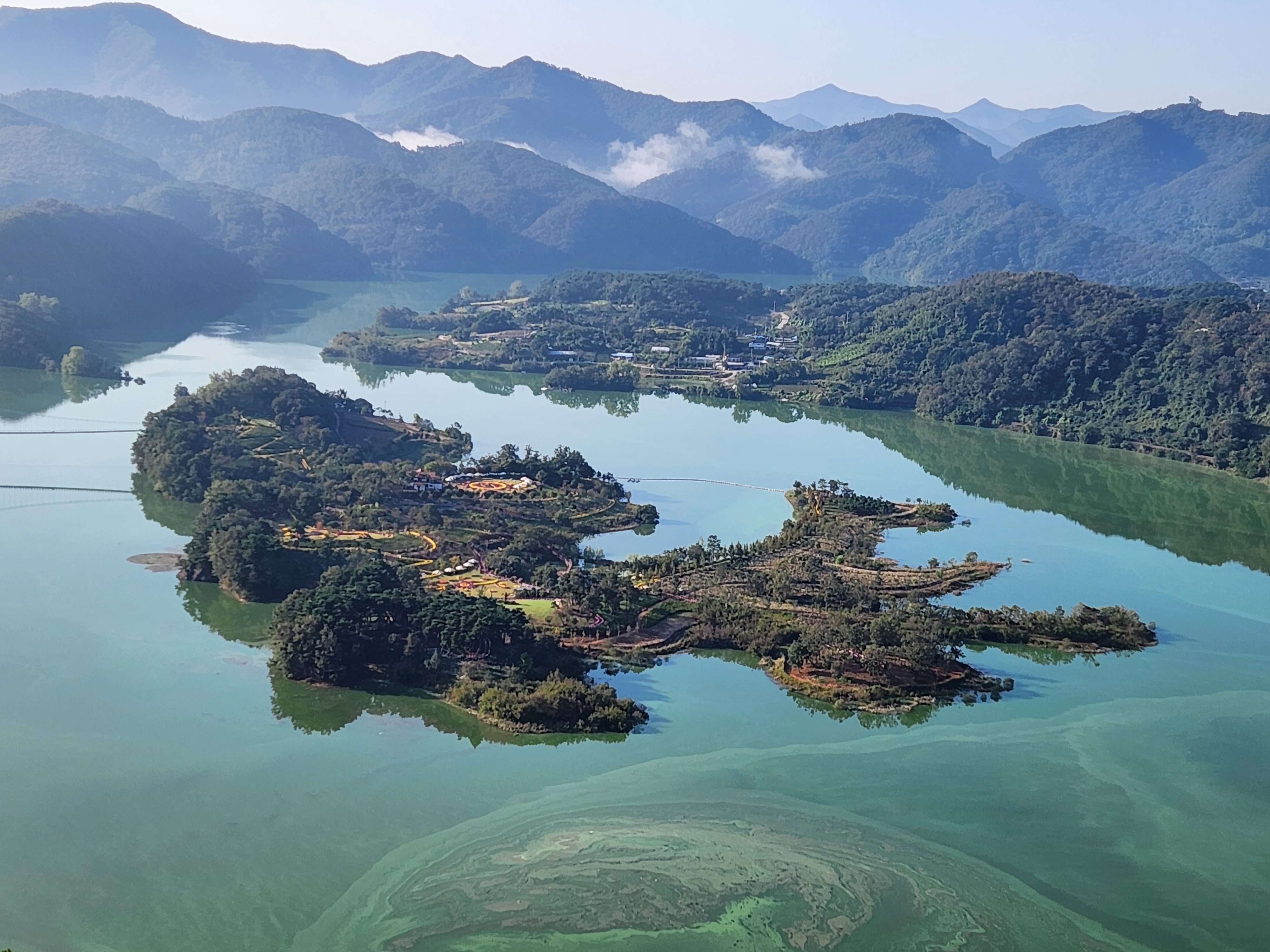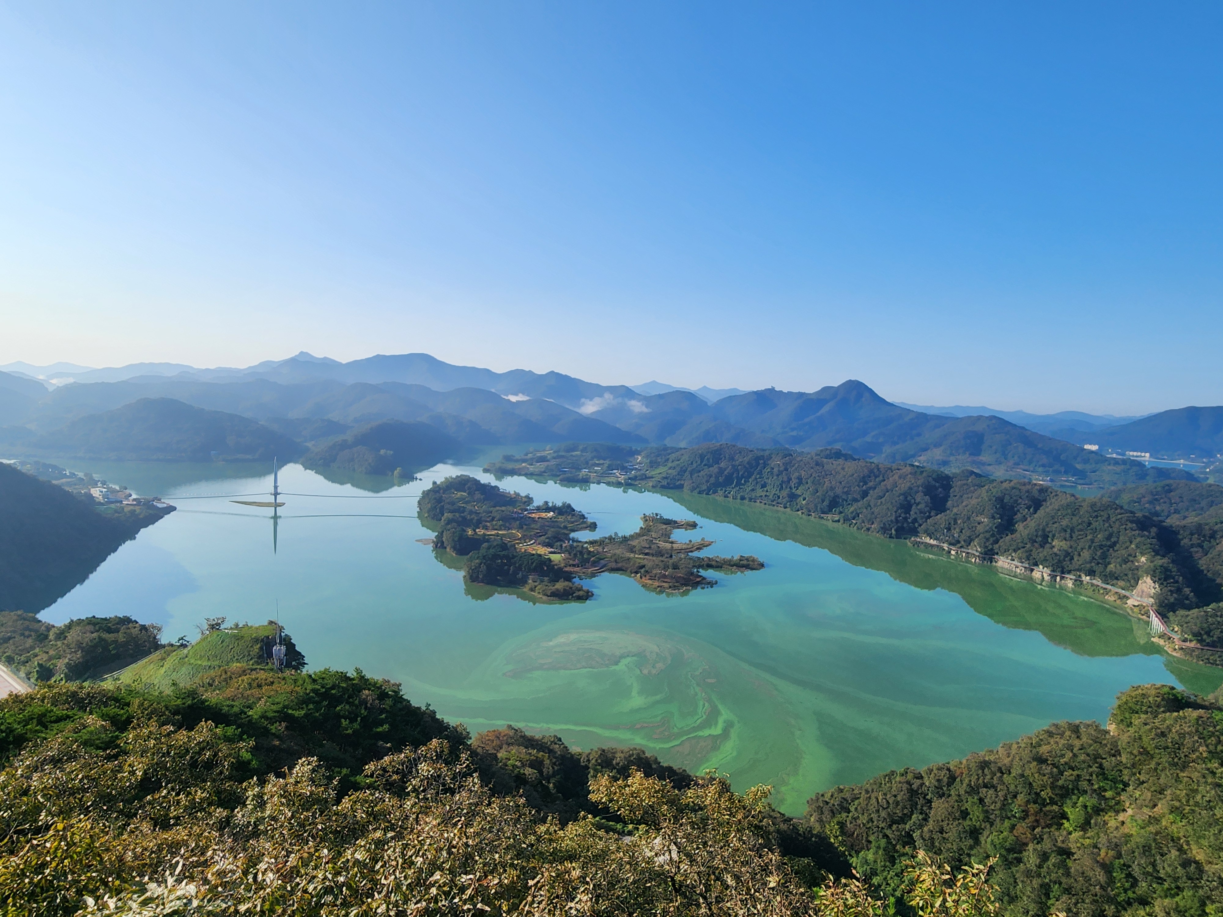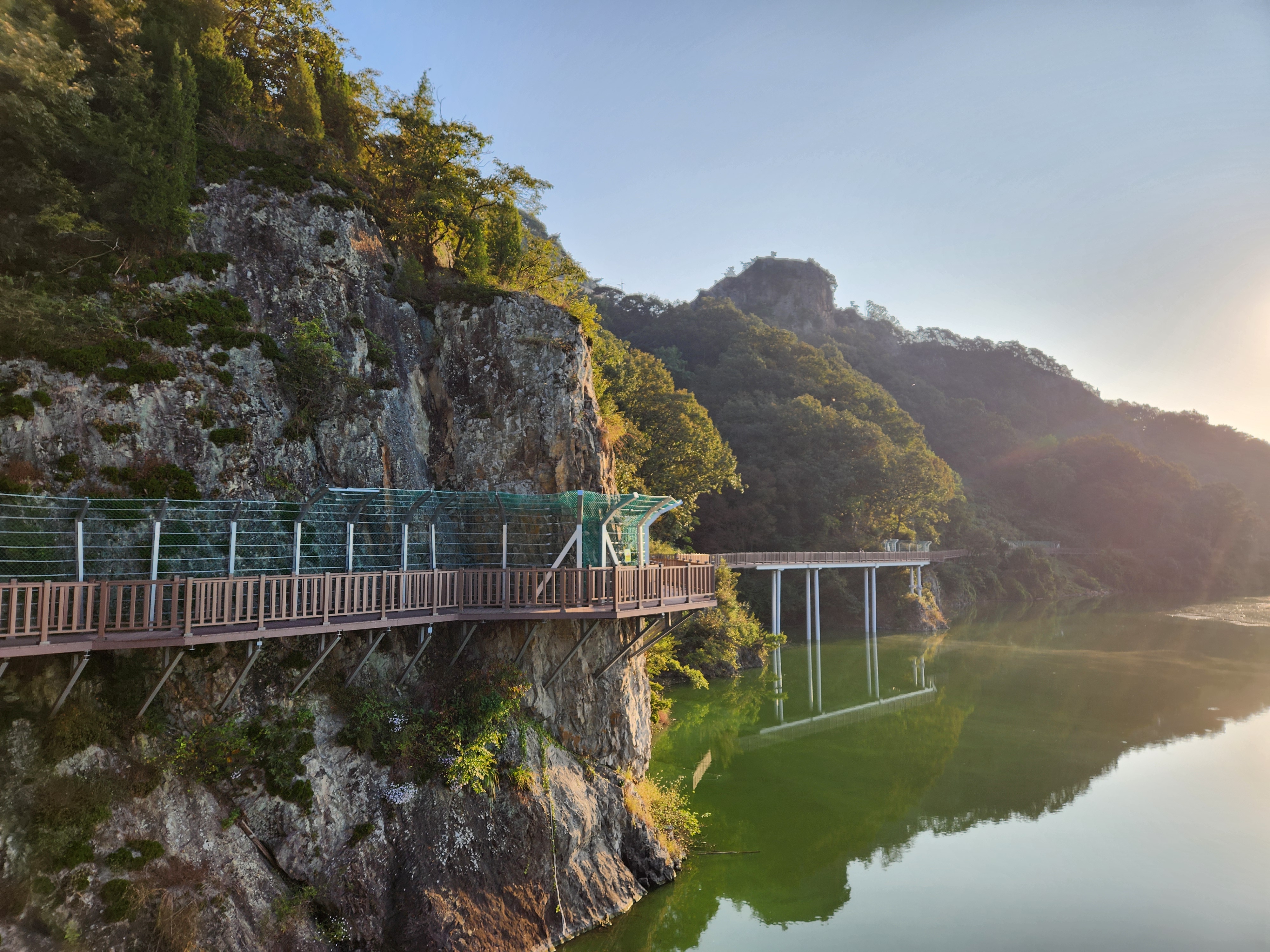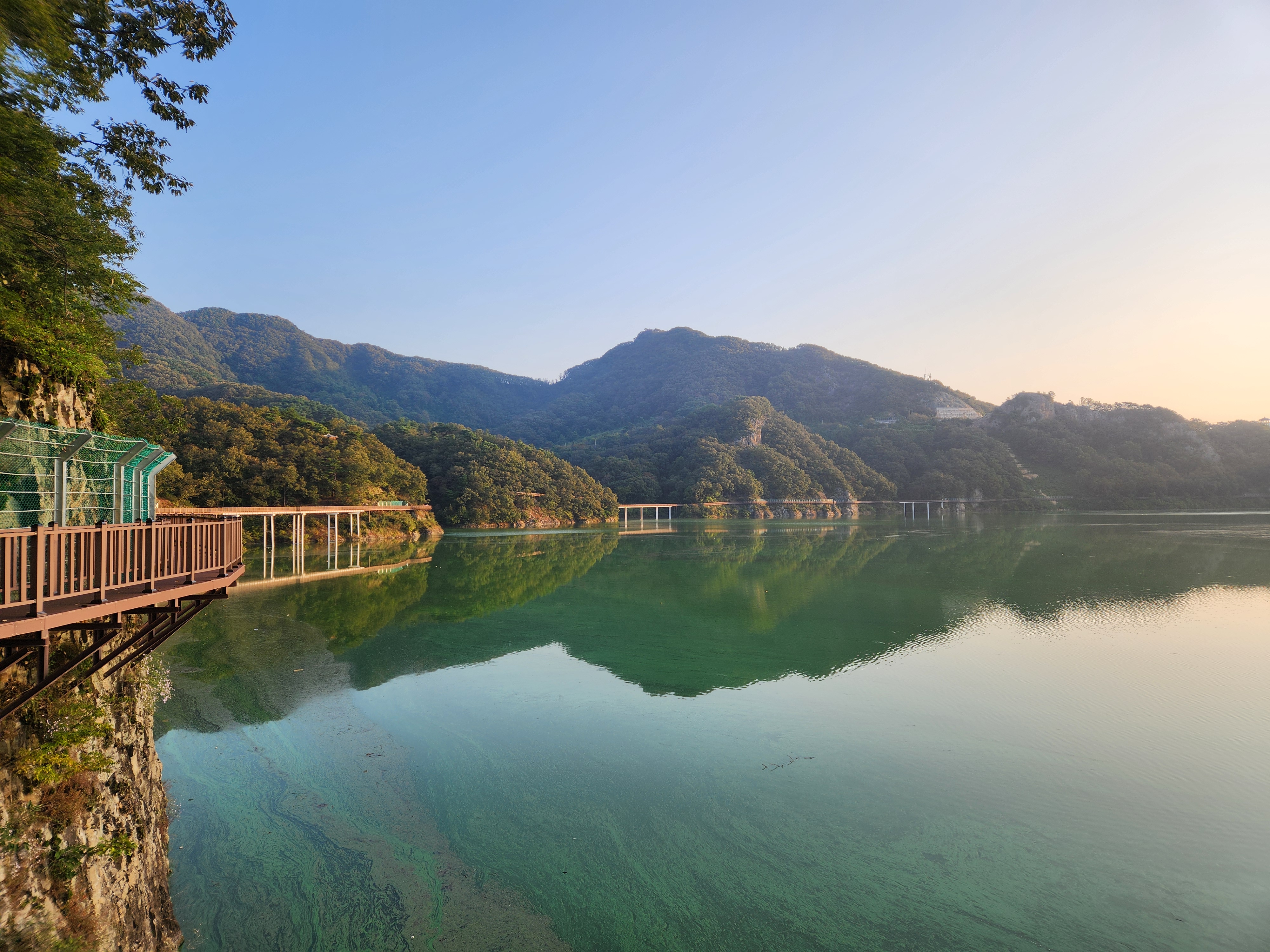 운암 전승지주차장 중간에 임진왜란 당시에 임실군 운암면 전투에서 천명의 의병을 이끌고 만여명의 왜군을 섬멸한 충장공 양대박 장군의 승전을 기념하기 위한 승전비가 세워져 있다.기존 옥정호 물안개길에다 4㎞ 붕어섬길을 새롭게 조성해 옥정호 붕어섬의 절경을 더욱 가까이 볼 수 있도록 했다. 전승지주차장에서 출발해 용운마을을 되돌아 와 붕어섬길과 출렁다리를 지나 붕어섬 생태공원 그리고 국사봉전망대까지 이어지는 약 12㎞ 탐방 코스를 걸어 본다.양대박 장군 승전비 옆으로 길을 따라 수변으로 갔더니 전망태크로 들어가는 곳을 막아 놓았다. 나 같은 사람이 한 둘이 아니었는가 보다 난간을 넘어간 흔적을 볼 수 있다.전승지주차장에서 용운마을까지 2.1km의 잔도길을 설치되어 있다.일교차가 큰 이른 가을 아침, 물안개가 피어오르며 섬의 자태가 드러나는 붕어섬의 모습은 절경이다. 이제는 현수교 출렁다리의 풍경까지 보게 되었다.걷는 내내 옥정호잔도길을 통해 붕어섬을 비롯한 옥정호의 주변절경을 감상할 수 있다.출렁다리에 이어 잔도길도 전국에 유행처럼 만들어 지고 있다. 삶의 질을 높이려는 목적이 있겠지만 과연 좋은 현상인지 생각해 볼 문제다.일출은 한참 지났지만 산에 가려 이제사 일출같은 모습을 볼 수 있다.간간히 쉼터도 있었 쉬어갈수 있으나 햇빛 가림막이 없는 것이 아쉽다.잔도길이 끝나고 용운마을까지 300여m 야자매트를 걷게 되어 있다.운암면 용운리용운마을 반환점에서 왔던 길을 되돌아 붕어섬출렁다리로 간다.되돌아 가는 길에는 오봉산과 국사봉이 전면에 들어와 좀 더 깊이 옥정호를 들여다보는 코스로 호수와 산이 빚어낸 작품들 속을 걸으며 신선이 된 듯한 기분을 느낄 수 있다.걷다보면 물속에 또 하나의 산세를 감상할 수 있다.그러고 보니 4코스 옥정호 물안개 길은 무장애 데크길이다. 전승지주차장에서 부터 갈지자로 무장애 데크길을 만들어 놓았다.다시 전승지주차장에서 출렁다리로 간다.잔도길을 걷다보면 길을 통해 감수성을 풍부히 끌어올리고 영감을 얻을 수 있으며,바라보는 것 만으로도 산과 호수가 빚어낸 붓터치와 상쾌한 바람을 맞으며 시상을 통해 누구라도 화가가 될 수 있고 시인이 될 수 있을 것이다.전승지주차장에서 약 1.9m 정도에 잔도길이 끝나며, 국사봉으로 올라가는 갈림길이 나온다.갈림길에서 300여 미터에 붕어섬출렁다리 매표소가 있다. 출렁다리는 09시부터 입장을 하여 국사봉 전망대부터 가기로 한다.등산길을 따라 가다보면 전망처에서 내려다 보는 붕어섬 출렁다리가 한폭의 그림같이 다가 온다. 붕어섬 주변에서 가장 높은 나래산 정상에 구름 띠가 둘러져 있다.잔도 갈림길에서 약 600여m 올라가니 도로건너 국사정 정자가 보이고 그 뒤로 보이는 봉우리가 국사봉이다.국사봉 주차장에서부터 바로 가파른 계단이 이어진다. 경사가 만만치 않아 거리에 비해 힘이 좀 드는 편이다. 다행히 가장 꼭대기 전망대까지 300m 정도에 불과해 시간은 많이 걸리지 않는다. 아주 천천히 걸어도 10분 안팎이면 닿을 수 있다.국사봉으로 올라가는 등산로에 3개의 전망대가 연속으로 나오는데, 마지막 3번째 전망대가 붕어섬을 조망하는대 제일 좋은 곳이다.전망대에 서면 발아래로 옥정호 물길이 수직으로 내려다보인다. 크게 휘돌아가는 물길 속 외앗날도 손에 잡힐 듯 가깝다. 옥정호 붕어섬으로 불리는 '외앗날'은 하늘을 닮아 푸른 호수에 거대한 금붕어 한 마리가 누워 있는 형상이다.오봉산과 국사봉 산이 호수를 양팔을 벌려 감싸 안은 듯한 풍경과 사계절 다르게 보여진 옥정호 붕어섬은 사진작가가 많이 찾는 최고의 명소다.아침햇살을 받아 호수 면으로부터 아지랑이처럼 피어오르는 물안개는 마치 신선이나 노닐 법한 풍경으로 국사봉에서 보는 옥정호 붕어섬은 최고의 백미로 마치 백두산 천지에 와있는 듯한 착각을 일으키게 하는 곳인데, 아쉽게도 안개가 없다.옥정호출렁다리 매표소에서 성인기준 4,000원으로 매표를 한 후 출렁다리를 건너간다.출렁다리 입구부터 가을의 감성을 물씬 담은 국화로 조성을 하여 놓았다.붕어섬에서 하루는 아니어도 반나절이라도 알차게 보낼수 있다.옥정호 출렁다리 개통과 더불어 눈으로만 보던 붕어섬은 생태공원으로 탈바꿈하였다.길이 420m, 폭 1.5m의 옥정호출렁다리는 붕어 이미지를 표현한 80m의 주탑과 스틸 그레이팅 바닥 판으로 강바닥이 보여서 건너는 내내 흥미를 더한다.물고기를 형상화한 외관도 독특하지만 주탑 전망대에 오르면 옥정호 일대가 파노라마로 펼쳐진다.출렁다리 입구는 요산공원이다. 공원은 꽃으로 알록달록 장식돼 있다. 그 너머로 망향탑이 우뚝하고 그 옆에 양요정이란 정자가 아늑하게 자리잡고 있다. 조선 선조 때 인물인 최응숙이 임진왜란 이후 낙향해 지은 정자다. 양요정은 맹자의 ‘인자요산(仁者樂山) 지자요수(智者樂水)’에서 왔다. 아래 강가에 있었던 것을 수몰되기 전 옮겼다고 한다.붕어섬은 강물이 휘돌아 가는 물돌이동 지형이다. 외앗날이라는 향토 지명이 있는데, 사진작가들이 애칭으로 붕어섬이라고 하여서 관광지 이름이 되었다.붕어섬의 구