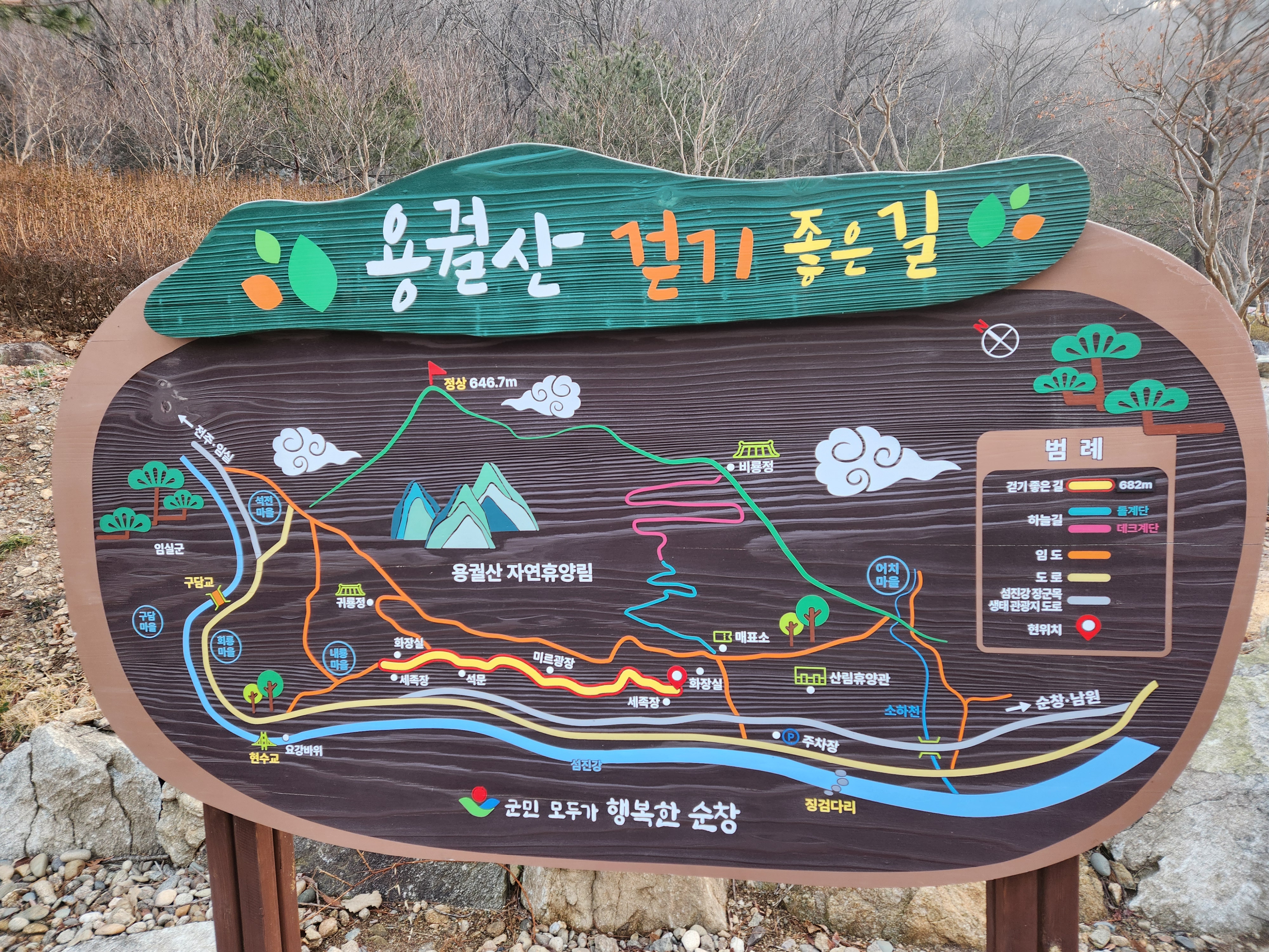 그동안 적성댐건설에 따라 설왕설래로 도로개설을 안한 곳인데, 장군목 진입도로 공사로 이곳 용궐산주차장도 조만간 변할것 같다.용궐산하늘길과 그 주변으로 용궐산자연휴양림이 조성되어 있다.용궐산하늘길 입장은 09시부터 입장을 한다. 입장료 4천원 중 2천원은 순창사랑상품권으로 돌려줜다.너무 이른 시간에 도착을 하여 용궐산자연휴양림과 요강바위를 둘러 보기로 한다.휴양림 내에 있는 돌로 만든 미로 광장이다.용 조형물도 보고,장군목 요강바위 입구에 왔다.섬진강 212㎞ 물줄기 가운데 가장 경치가 빼어나다는 ‘장군목’ 일대 풍경이다. 수만 년 동안 거센 물살이 다듬어 놓은 기묘한 형태의 바위들이 3㎞에 걸쳐 드러나 있는 장군목이다.그 중 거북바위와 요강바위가 장군목의 자랑거리다.거북바위에서 바라보는 요강바위와 현수교.요강바위로 이동중에 건너편 물가에서 먹이활동을 하고 있는 수달가족에 잠시 숨죽여 지켜본다.말도 많고 탈도 많았던 요강바위다. 요강바위를 볼때마다 자연의 신비를 느낄수 있다.현수교 다리로 이동을 한다.현수교에서 섬진강 상류를 바라본다.하류쪽 풍경.요강바위에서 임도삼거리로 올라 가면서 내룡마을을 내려다 본다.삼형제바위에서 내려오다 만나는 임도 삼거리다.임도삼거리에서 용궐산정상으로 올라가 하늘길로 내려갈까 생각도 해 봤지만 산림휴양림 방향으로 다시 가기로 한다.용굴로 올라가는 갈림길을 지나서,귀룡정삼거리다.용알바위길로 올라간다. 용굴에서 하산하면서 이길로 내려오면 되는데 헛 고생을 한다.줄탁동시(啐啄同時)가 암각된 바위 옆에 용알바위가 보인다. 줄탁동시는 안과 밖의 준비가 같은 때에 이루어질 때 성장이 완성된다는 뜻의 한자성어다.마치 칼로 쪼갠 듯 가운데가 갈라진 '용알바위'가 있다. 전해지는 이야기로는 용이 알을 깨고 나왔다 하여 지금도 신성한 상징물처럼 여겨진다.이상 자연휴양림길을 마무리하고 매표소로 간다.매표 후 입구 등용문에서 부터 이어지는 돌계단을 10분 정도 오르면 본격적으로 ‘하늘길’이 시작된다.예로부터 산의 형세가 마치 용의 뼈처럼 굳세다 하여 '용여산'이라 불리다가, 2009년 4월 7일 주민들의 뜻을 모아 '용이 사는 궁궐'이라는 의미의 '용궐산'으로 정식 명칭을 바꾸었단다.산 이름의 옛 형태인 '용여산'은 암룡을 뜻하며, 실제로 산 곳곳에는 용과 관련된 전설이 스며 있다. 하늘길이 조성된 거대한 절벽은 '용여암'으로 불린다.마치 용의 등줄기를 따라 걷는 듯한 기분이 들 정도로 길의 형태와 절경이 웅장하다. 중간중간 조성된 쉼터와 전망대에 앉아 잠시 숨을 고른다.잔도를 따라 산을 오르다 보면, 마치 하늘 위를 걷는 듯한 기분을 만끽할 수 있다깎아지른 암벽에 늘어선 잔도를 걸으며 섬진강을 한 눈에 조망은 아찔한 절벽 아래로 섬진강 212㎞ 물줄기 가운데 가장 경치가 빼어나다는 ‘장군목’ 일대 풍경이 한눈에 들어온다.용궐산 곳곳 자연 암벽에 '한자'를 새겨 넣었다. 추사 김정희 서체로 된 '계산무진(溪山無盡)'이다. '계곡과 산은 끝이 없다'는 뜻을 담고 있다.용비봉무(龍飛鳳舞)지자요수 인자요산(智者樂水 仁者樂山)안중근 의사의 손도장으로 유명한 '제일강산(第一江山)`바위 벼랑에 1,069m인 전국 최고의 잔도로 용이 꿈틀거리며 날아오를 듯한 잔도끝에 비룡정에 왔다.비룡정 이후 부터는 본격적으로 용궐산 등산이 시작된다.비룡정에서 300m 올라가면 느진목이 나온다.느진목에서 600m 오르면 `된목`이다.된목에서 400m 올라가면 용궐산정상이다. 정상에는 신선이 바둑을 두었다는 전설이 깃든 신선바위가 있었으나 지금은 세월에 마모되어 흔적을 찾아보기 어렵다.정상 전망대에서 잠시 주변을 살펴본다. 아스라히 고추장으로 유명한 순창시가지가 눈에 들어온다.내룡마을과 장군목 전경.정상옆에는 한국전쟁 당시 빨치산의 참호가 남아 있어 전쟁의 상흔을 증언한다.정상에서 된목으로 내려와 용굴방향으로 하산한다.용굴갈림길.암용이 살고 있었던 '용굴'이다. 길이 10m 남짓한 굴이다.용굴에서 70여m 바로 아래에는 용이 노닐었다는 암자 터가 남아 있어 '용유암'으로 불렸단다. 용유암은 고려 나주 임씨의 중시조 임문수와 얽힌 이야기가 전해지는 곳으로, 오랫동안 명성이 자자했다. '용유암에서 공부하면 과거에 급제한다'는 말이 전해져 수많은 선비가 이곳을 찾아와 글을 읽었다고 한다. 지금은 소실되어 그 흔적을 찾기 어렵지만, 전설만은 여전히 살아 숨 쉬며 용궐산의 신비로움을 더한다."땅의 영기로 걸출한 인물이 태어난다"는 인걸지령(人傑地靈)용굴길은 너럭바위로 만들어진 길이 휴양림임도길 까지 이어진다.귀룡정귀룡정 옆에는 신상귀라는 큰 바위가 있는데, 앉은 자리에서 담소할 때는 남의 이야기를 하지 말라는 뜻이란다.'하늘길'이라는 이름 그대로, 절벽 위를 걷는 길은 인간의 도전과 자연의 아름다움이 만나는 지점이다. 전설과 역사가 깃든 용굴과 용유암, 용알바위, 그리고 섬진강의 요강바위까지 더해져 용궐산은 지역의 정체성과 이야기를 품은 살아 있는 산이다.